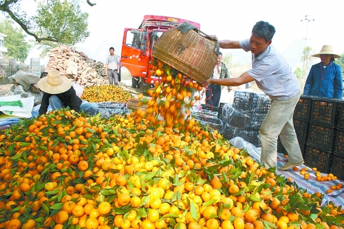近年来,阳朔县普益乡古乐村通过调整产业结构,大力发展种植砂糖桔、南丰蜜桔,在阳朔农村合作银行的资金支持下,种植规模不断扩大。目前该村砂糖桔种植面积达2000亩,仅此一项去年人均收入达到4000元。图为村民销售南丰蜜桔。