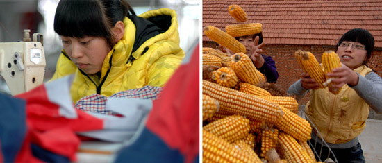 前尹家村村民尹飞在乳山艾丽斯制衣有限公司车间缝合衣服(左图);下班后尹飞在家中帮助母亲干农活(右图)。