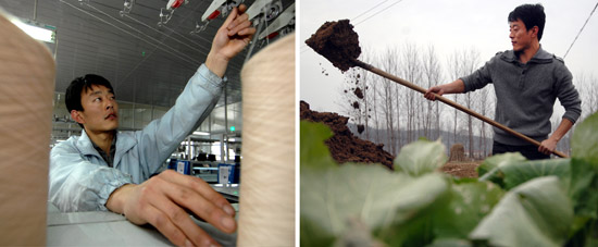 店子头村村民张新建在乳山艾丽斯制衣有限公司全自动电脑横机前操作(左图);下班后张新建在田中干农活(右图)。