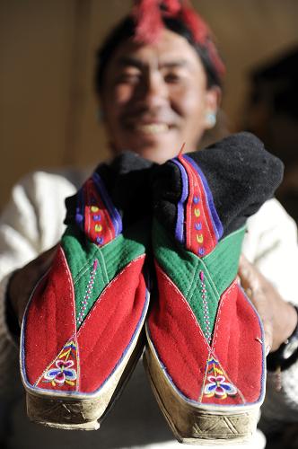 12月10日,来自西藏日喀则拉孜县曲马乡的农民边巴展示自家传统藏靴。