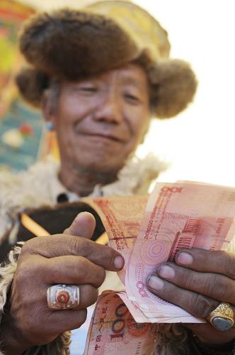 12月10日,来自西藏日喀则拉孜县的洛桑老人卖完藏刀后在点钱。