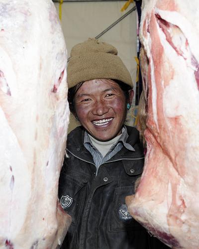 12月10日,来自西藏日喀则萨嘎县的农民群培展示自家待售的牦牛肉。