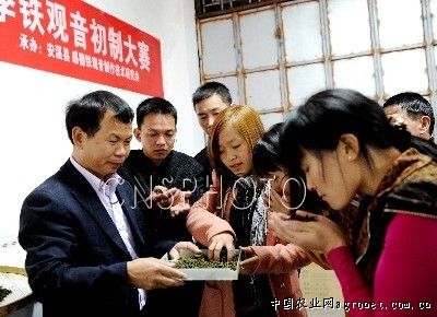 安溪县感德镇被誉为中国茶叶第一镇。作为名茶安溪铁观音主产区之一,感德镇全镇6万多人口中有百分之九十五从事茶叶种植和加工产业,拥有茶园面积5.8万亩,年产茶叶达5000吨,产值超12亿元人民币。产品畅销30多个国家和地区。上图为12月初,为了提高茶农制茶的技术工艺,安溪县感德镇铁观音制作技术研究会举办的制茶技术交流会。