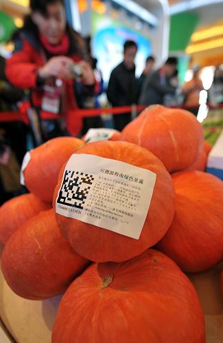 这是有可溯源二维码标识的南瓜(12月12日摄)。通过手机拍摄扫描二维码,可追溯海南瓜菜生产源头。