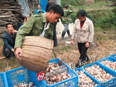 12月10日,湖南省怀化市"通道绿生源菇业合作社"的工作人员在田间向菇农收购香菇。近年来,通道通过"合作社+基地+菇农"的形式,发展菇农300余户,2011年种植香菇600万袋,预计生产鲜菇400多万公斤,鲜菇远销江浙、两广等地,创产值3000万元,有效促进了农业产业结构调整和农民增收致富。
