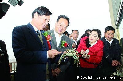 泗洪县委书记徐德(左二)陪同中国渔业协会河蟹分会会长李国平(左一)欣赏泗洪大闸蟹