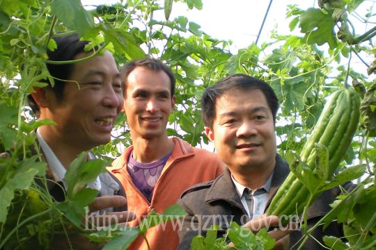 黄开宏局长(右一)陈图进副局长(左一)喜看大棚里的苦瓜