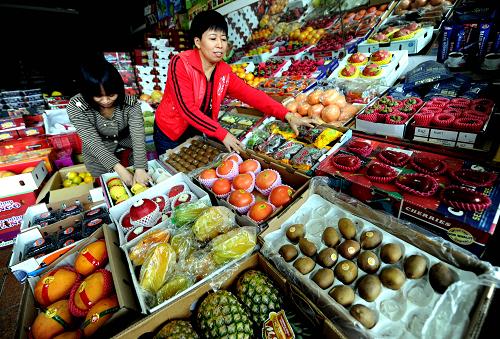 12月13日,营销人员在厦门市中埔台湾水果销售集散中心整理货架。