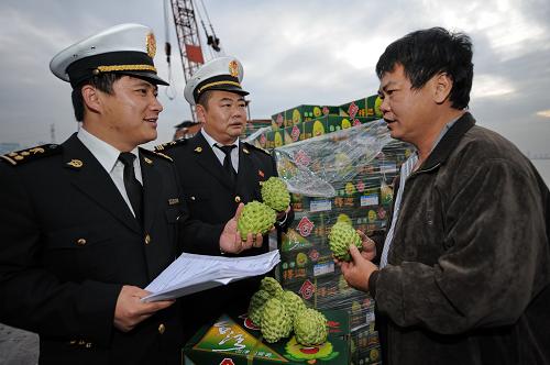 根据两岸经济合作框架协议(ECFA)“早收”计划,从2011年1月1日开始,香蕉、橙、柠檬、哈密瓜、火龙果等5种台湾水果进入大陆市场享受5%到10%不等的降税优惠,到2012年将实现零关税。为让台湾水果顺利进入大陆市场,厦门海关采取提前报关、优先接单、专人核单、24小时通关等措施,实现台湾水果当天到港当天验放,及时进入大陆市场销售。新华社记者 张国俊 摄