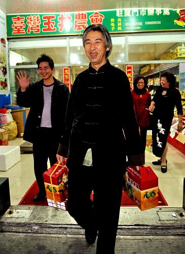 12月13日,在厦门从事台湾水果生意的高雄县青果公会理事长、泰吉水果行林全和(右)先生在厦门港和海关关员交流台湾水果报关事宜。