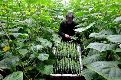 2011年11月16日,山东邹平县焦桥镇菜农在采摘黄瓜。