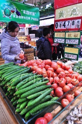 2011年11月29日,消费者在山东邹平县一超市购买蔬菜。
