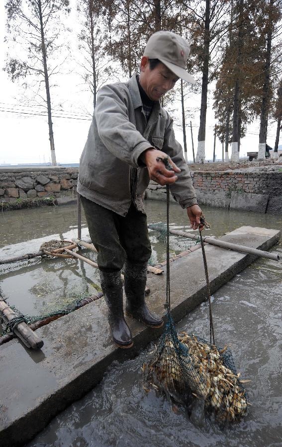 12月15日,崇贤街道北庄村的村民俞茂泉在清洗慈菇。