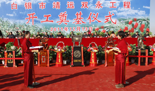 开工奠基仪式上,李建华宣布靖远双永供水工程开工;张智全致辞;汪海洲主持仪式;省水利厅副厅长陈德兴介绍工程基本情况。