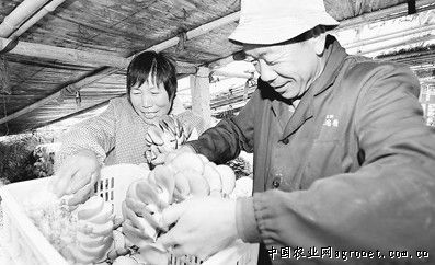 河南省辉县市冀屯镇把发展食用菌作为促进农民增收的主要措施,全镇已发展食用菌大棚10000座,成为全省最大的平菇生产基地。图为冀屯镇益三村群众正在大棚内采摘平菇。