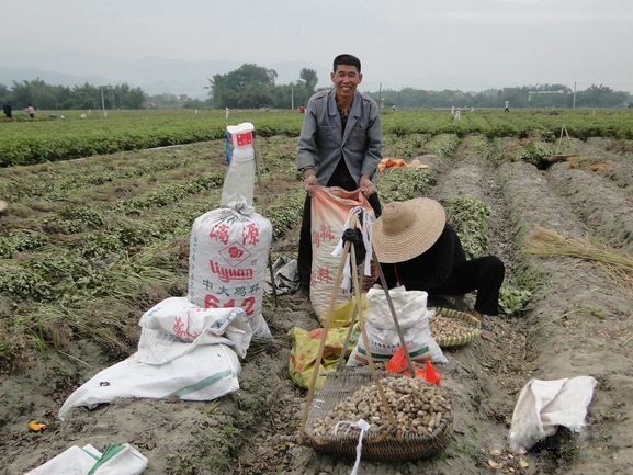北流市西?镇西?村农民、50多岁的李日龙告诉笔者,他自上世纪80年代初“分田到户”时,就开始种花生了,30年来一直坚持年年种自家的六分多地,年年有收入,并且收入逐年递增。去年收入约2000元钱,今年的收入要比去年略有增加。西?镇花生种植历史悠久,是北流、玉林乃至广西远近闻名的“花生基地”,几乎家家户户种花生,全镇今年秋花生种植面积超过10000亩。在这里,像李日龙那样的“花生农”数不胜数。