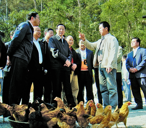 农业部部长韩长赋(前左三)在自治区副主席陈章良(左一)的陪同下,到新安镇那劳林下养鸡点视察。