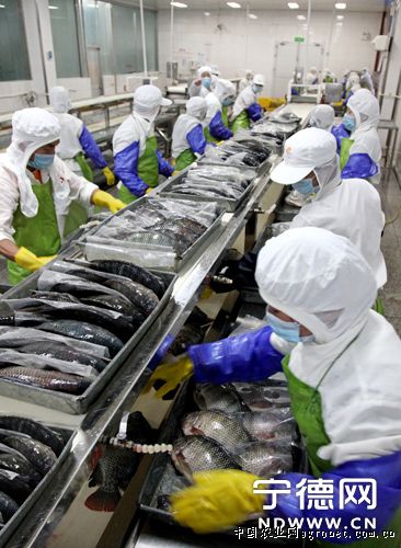 日前,福建宁德市夏威食品有限公司加工车间内,员工正在现代化水产品深加工自动化生产线上包装准备出口日本的罗非鱼。该公司主要生产大黄鱼系列产品、真鲷系列产 品、罗非鱼系列产品,远销美国、加拿大、日本等国家。据悉,今年宁德市水产品出口贸易保持平稳增长,1至10月 ,共检验检疫出口水产品68342.7吨,货值3.09亿美元,比增65.83%和91.82%。