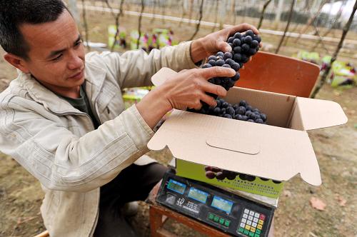 12月21日,在广西百色市平果县果化镇永定村百布屯,壮族村民石昌平在自家果园里把刚刚摘收的葡萄过秤、装箱。目前,当地种植的“一年两熟”葡萄成熟上市。冬季葡萄开秤售价达每公斤16元,比夏季葡萄高出4元,成为当地壮乡农民增收的一条重要途径。新华社发(罗郅肯 摄)