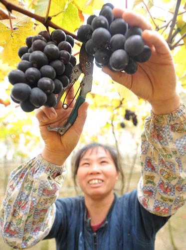 12月21日,在广西百色市平果县果化镇永定村百布屯,壮族村民农花桃在自家果园里摘收葡萄。