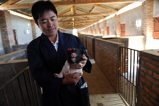 12月24日,饲养员抱着将要出栏的小香猪向游客介绍生长情况。