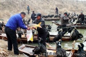 记者看到,多的时候有五六只鸬鹚抢捕一条鱼;有的鱼太大,一只鸬鹚甚至被鱼拖沉下水,只有翅膀露出水面,这时渔民就赶紧用网兜把鱼网上来。而稍小一点的鱼,鸬鹚可以直接“吞”进喉咙,然后飞上船,渔民只要用手一捏脖子,鱼便吐出来(放出鸬鹚前,渔民会在鸬鹚的脖子上套一个环,防止鸬鹚吞鱼)。