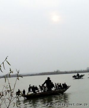 16:30,渔民开始收工。冬天天黑得早,这时太阳已开始落山。夕阳下,一只只鸬鹚排成两队站在船上。“位子是固定的,每只船上的鸬鹚队都有等级,‘老大’站在船头。”