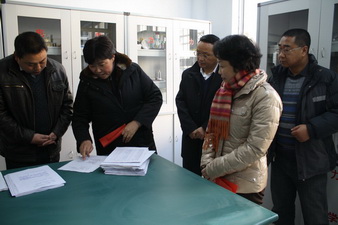 图为市委常委、宣传部长张?在九年制学校查看实验室资料建设