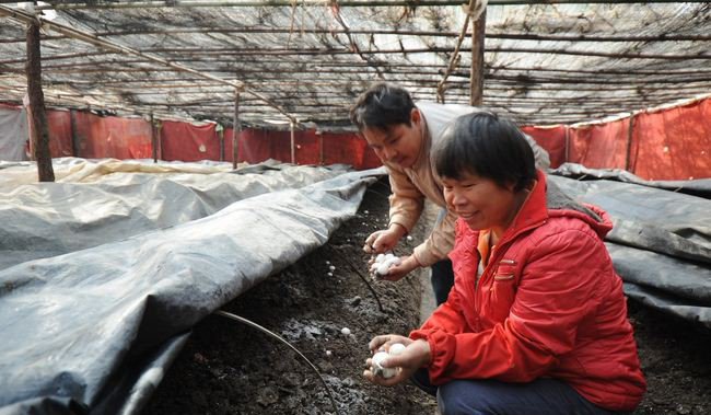 图为兴业县卖酒镇党州村农民在收采蘑菇