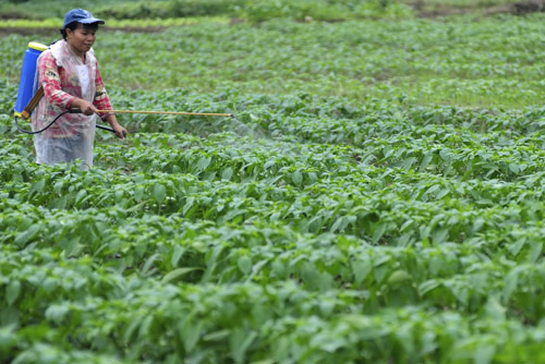 海南省琼海市菜农对辣椒进行田间管理(12月7日摄)。