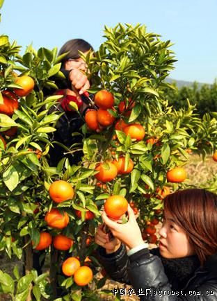 几位游客正在长街青珠农场西关分场采摘宁海年橘。