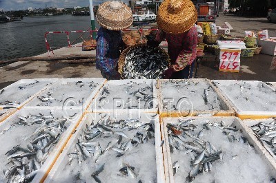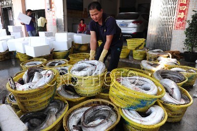 海南琼海市的渔民正将海鱼装箱准备外运。(2011年9月19日摄)