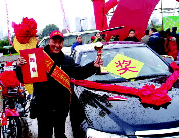 蓬莱刘家沟镇农民李尚四今年种了4亩红富士苹果,由于品级较高,给他带来的总收入达到10万元。日前在由省林业局、国家苹果工程技术研究中心等举办的2011山东苹果王大赛中,他被评为冠军,不仅获得了奖品小轿车一辆,还被聘为大赛形象代言人。