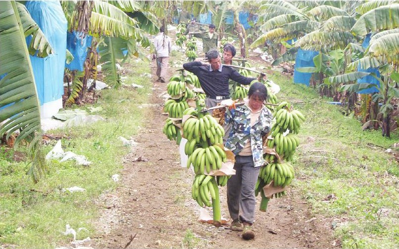 由于受去年持续低温天气的影响,南宁香蕉大约推迟两个月上市,但是今年销售却不成问题。8日下午3时,记者在同富坡的香蕉地里看到一片繁忙景象,一辆大货车等在田间装香蕉,装箱工、打包工、切割工以及挑运工,将香蕉从地头搬运到货车上。