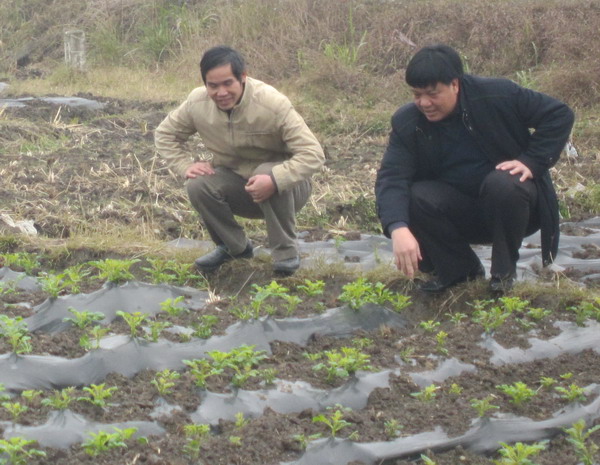 来宾市农业局副局长张大刊(右)察看马铃薯生长情况
