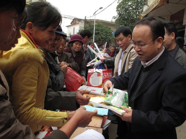 图为姚起权书记及技术人员在给群众发放农业技术资料