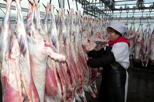 1月13日,内蒙古力农集团工人在生产车间分割羊肉。