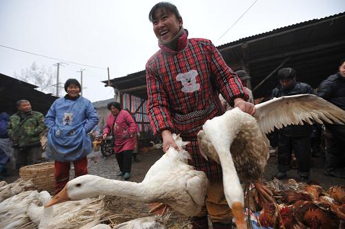 1月15日,安徽肥西县三河镇的一名农民将鹅出售给前来选购年货的人们。新华社发(杨晓原 摄)