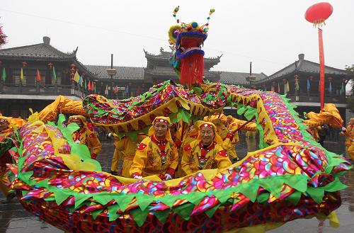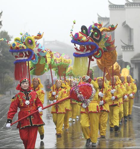 1月15日,安徽肥西县三河镇民间艺人在古镇街头舞龙。新华社发(徐勇 摄)