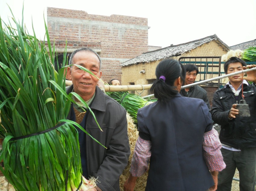 图为钟山县公安镇杨秀名(右一)在大桥村委牛岩屯收购大蒜外调情景