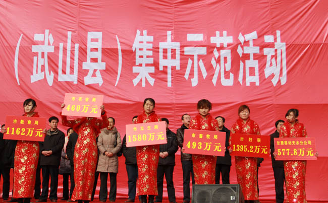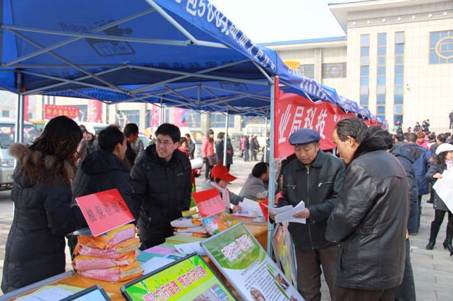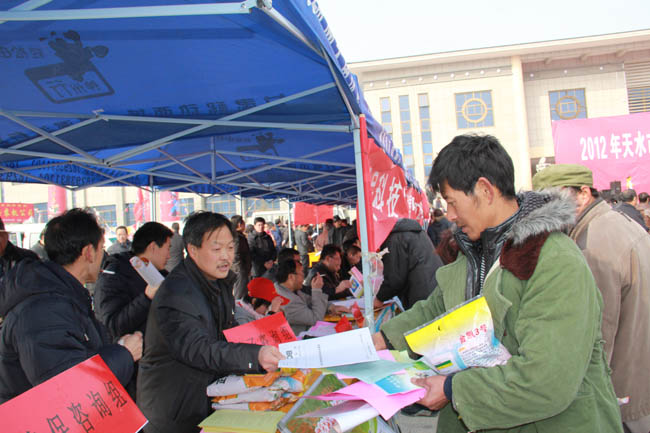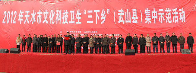 1月15日,天水市文化科技卫生“三下乡”集中示范活动在武山县举行。市农业局副局长吴毅中带队,组织蔬菜、种子、植保、农村能源、农技推广、土壤肥料、农业机械、惠农政策等方面的10多名农业专家,积极参加“三下乡”集中示范活动。支持武山县蔬菜工厂化育苗及马铃薯脱毒种薯体系建设等项目资金460万元;现场发放农业宣传资料3500多份,挂图200多份,接待农民群众300多人,就农民关心的蔬菜品种和栽培技术、设施农业病虫害综合防治、农作物测土配方施肥、全膜双垄沟播技术、农村沼气后续管理、农村土地流转、农机具购置补贴、惠农政策等方面的问题进行了现场解答,为广大农民群众解决了一些生产生活中的问题。