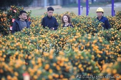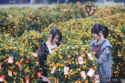 1月17日,二位销售人员在装饰待销的金桔。随着龙年新春的临近,海南琼海市大批贺年金桔陆续上市,展销金桔的万泉河广场一片金黄,呈现出一片吉祥和谐的节日气氛。