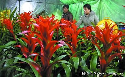 顺河西街某花卉市场内,消费者在选购凤梨盆栽。
