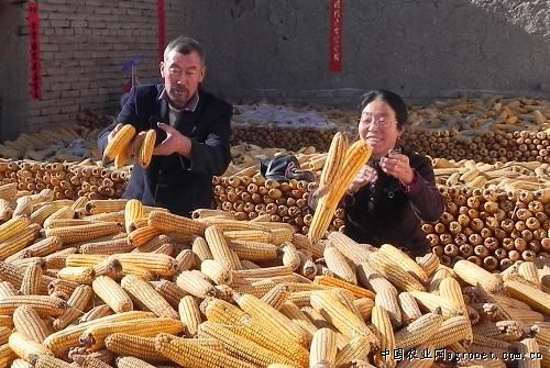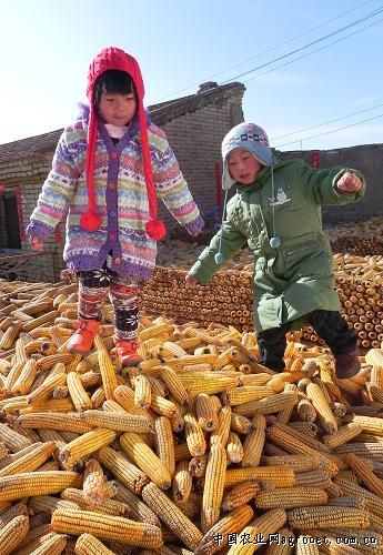 1月23日,内蒙古呼和浩特市和林格尔县盛乐镇农民在院中晾晒玉米。最新统计显示,2011年内蒙古自治区粮食总产量达477.5亿斤,较2010年增长45.9亿斤,同比增长10%以上,创历史新高。