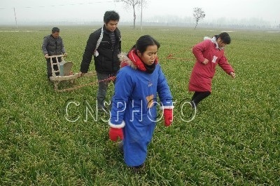 1月28日,河南省淮阳县白楼镇大李行政村小菜园村农民在麦田里用木耧为冬小麦追施返青肥。新春刚过,当地广大农民抓住天气晴好的有利时机,就纷纷投入到麦田施肥和春耕生产与管理当中,为小麦丰收打下良好基础。