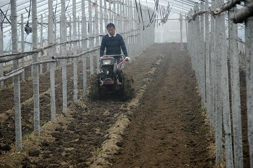 1月30日,河南淮阳县城关镇刘庄村村民用农机在大棚里耕地。