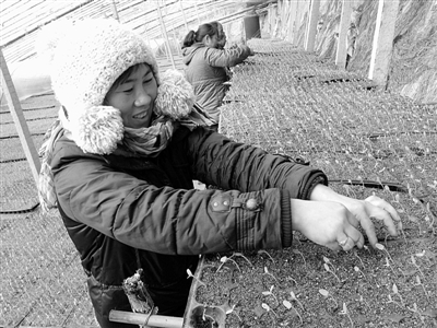 内黄县马上乡七里井村农民在帮助瓜苗脱壳。内黄县马上乡许多菜农都是在蔬菜大棚里“伺候”着自家的瓜苗过春节的,期盼有个好收成。