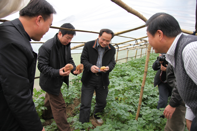 邓长球副市长每到一地,详细听取当农业部门的汇报,在田间地头与农技人员、村干部、农民群众和外地客商亲切交谈,还在实地挖开泥土,察看马铃薯生长情况。对玉林市发展冬种马铃薯的思路和成绩给予肯定的同时,强调指出:冬种马铃薯的发展,要与新农村建设相结合、要与培育农村产业支撑相结合、要与群众增收致富相结合,努力发展规模化、科学化、标准化的现代农业。同进要联系各地客商,做好销售的各项准备工作,让农民种得出,卖得出,丰产又丰收。从调研的情况来看,马铃薯种关乎农民的收成,关乎农民的希望,保证种子质量就是保护了农民的利益,也是全市的冬种生产的生命。农业部门应该走产研相结合之路,在研发上多下功夫,要科技领先,研发出适合玉林冬种马铃薯的创新种植技术。在产业结构调整上下功夫,像东平镇塘龙村主任林辉成,带领农民在水利条件不是很好的地里一年种植两季优质红薯、一季冬种马铃薯,亩均产值超万元,以合作社的形式推广,带动农户效果好,这样的典型要积极推广。要充分发挥辐射带动作用,带动周边经济发展,促进农业增收,农民致富。