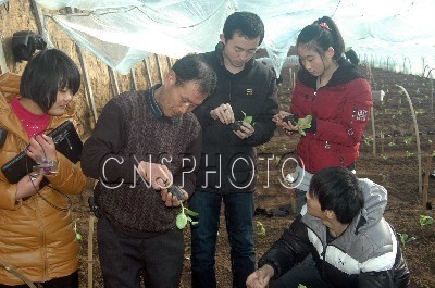 2月1日,在山东青岛胶州良河生态园种植基地,农民赵桂倡与聊城大学生一起学习科技知识。春耕在即,许多农户为种植增收犯难。近日,山东聊城大学“植物小专家”深入省内各地区,通过观看视频、赠送农业科技书籍、现场示范指导等方式为当地群众进行讲解蔬菜、水果的培植技巧等,帮助农民增产增收。