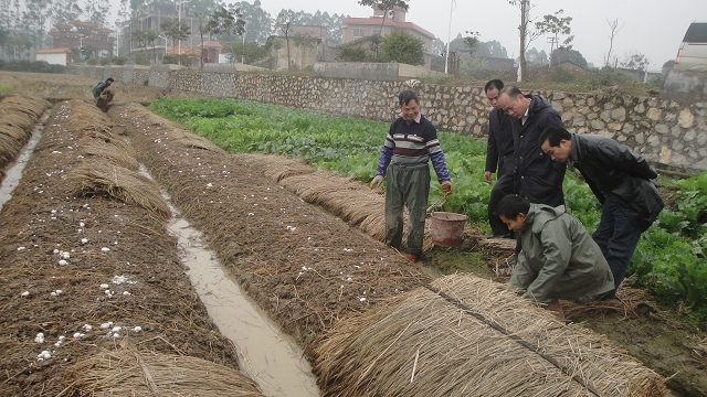 据了解,兴业县把发展蘑菇种植作为促进农民增收的一项重要产业来抓,在总结多年种植经验的基础上,2011年冬首次推广蘑菇无粪无棚种植新技术,以城隍镇湖村为连片种植示范基地,发展蘑菇规模化种植。基地面积250亩。在农业部门的指导下,由玉林市玉光食用菌有限公司联合四川绵竹锦鹏食品有限责任公司,以“公司+基地+农户”的形式合作开发的。四川绵竹锦鹏食品有限责任公司负责提供技术和保证产品的回收,玉光食用菌有限公司负责发展种植户,扩大种植规模。